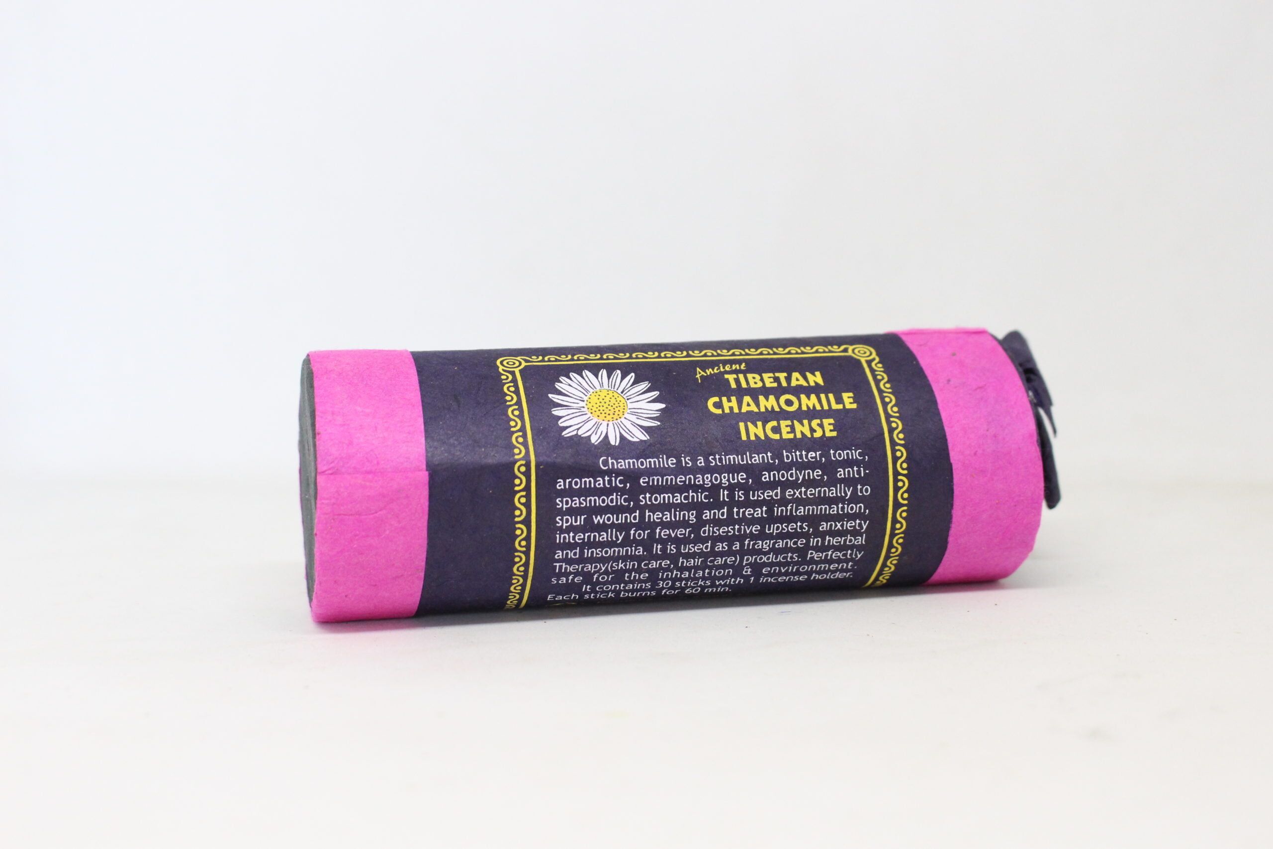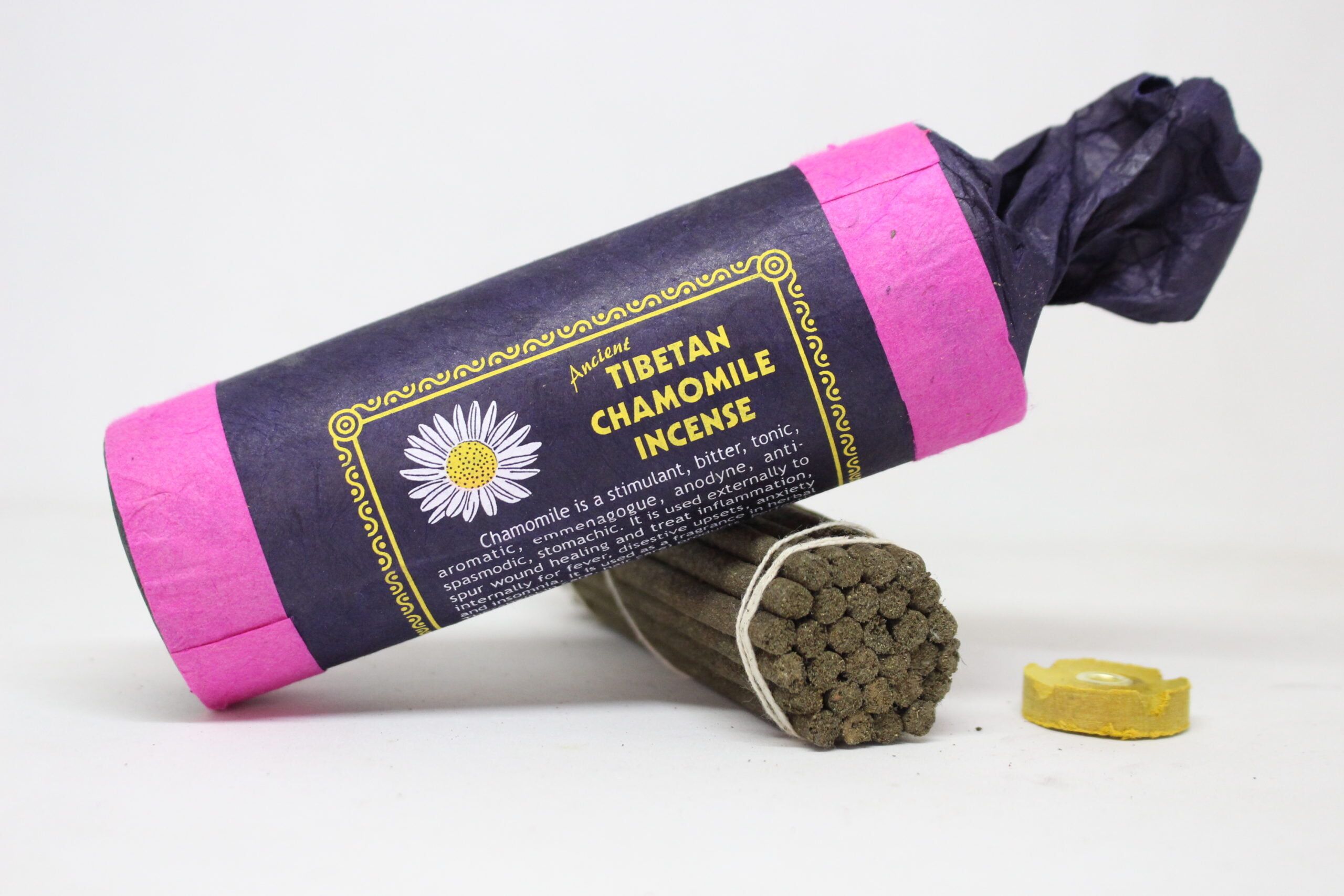 This Ancient Tibetan Chamomile incense is a stimulant, bitter, tonic aromatic, emmenagogue, anodyne, anti- spasmodic, stomachic. It is used externally to spur wound healing and treat inflammation internally for fever, digestive upsets, anxiety and insomnia. It is used as a fragrance in herbal. Therapy (skin care, hair care) products. Perfectly safe for the inhalation & environment.
