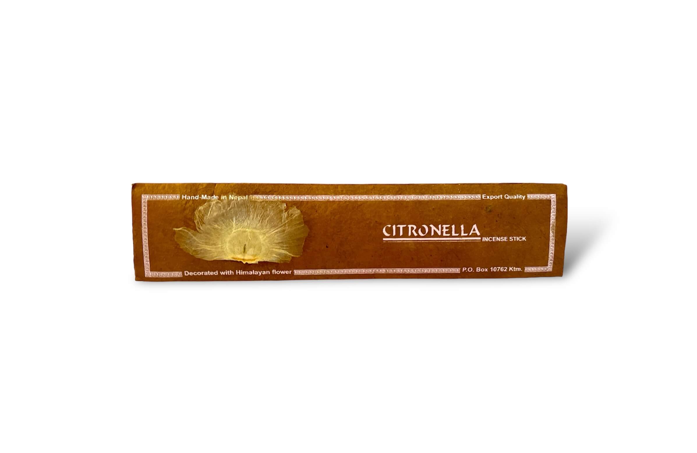This Citronella Flora Incense Stick is made from the selected natural and best quality plants and herbs found in the Himalayan region of Nepal. The fragrance of this spiritually uplifting incense is combined to bring peace, harmony, joy and relaxation. You can use this incense in the office, gym, yoga session, meditation and for peaceful and quite environment. The packaging is done with Eco friendly Lokta paper decorated with a Himalayan flower in it.