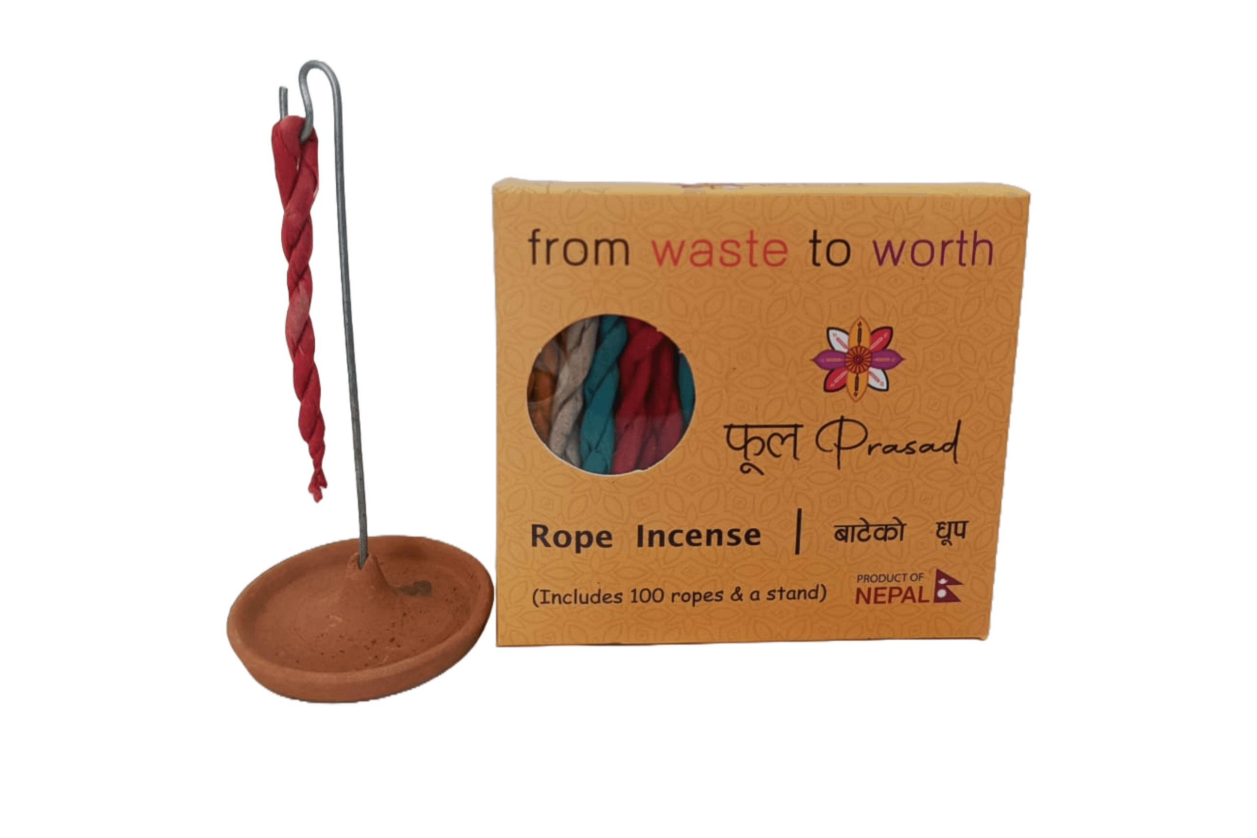 Colorful Rope Incense, a set of handcrafted rope incense made with care in Nepal. Each pack contains 4 colors of paper (Yellow, Red, Blue and Natural White), with each color having 25 rope incense that burns up to 15 minutes. The colorful papers are made of Nepali paper from high-altitude tree bark, with colors added for beautification.