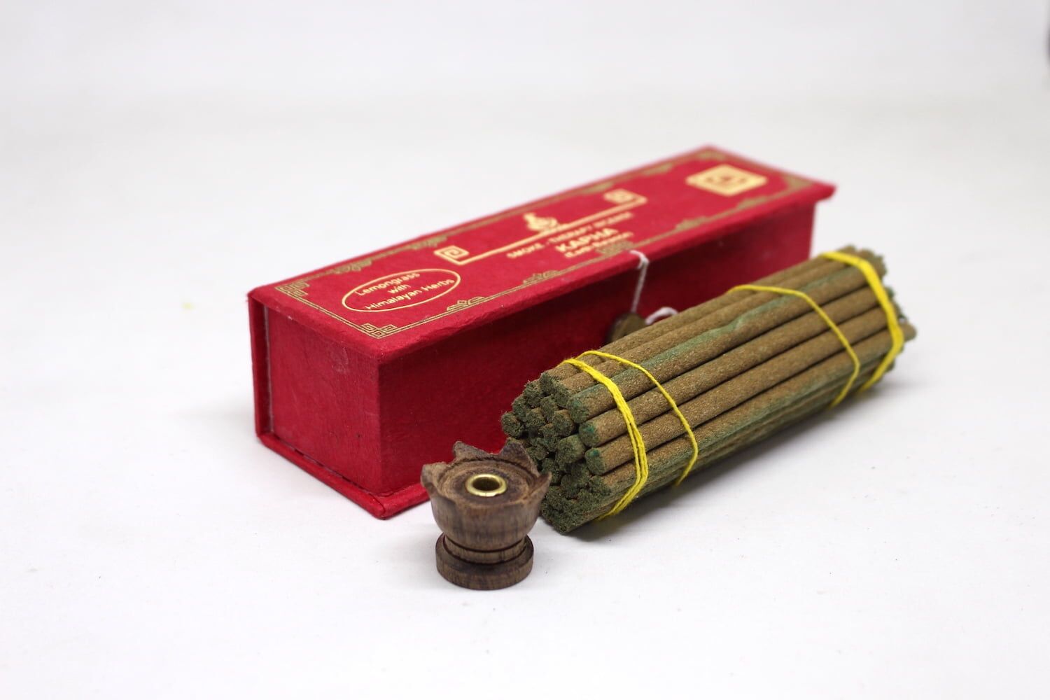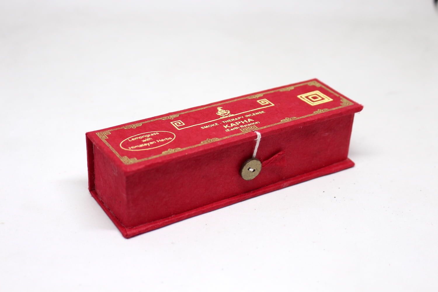 This is the Smoke Therapy Lemon Grass Kapha Incense made with a blend of special herbs and ayurvedic formula helps you to uplift, invigorate and stimulate the Kapha dosha. It has been formulated with various ayurvedic herbs, resins and essential oils along with rosemary with the main ingredient that is known to get rid of negative energy, increases creativity, awakens the heart & soul, and can increase sensitivity. The incense also comes with a small wooden incense stick holder inside.