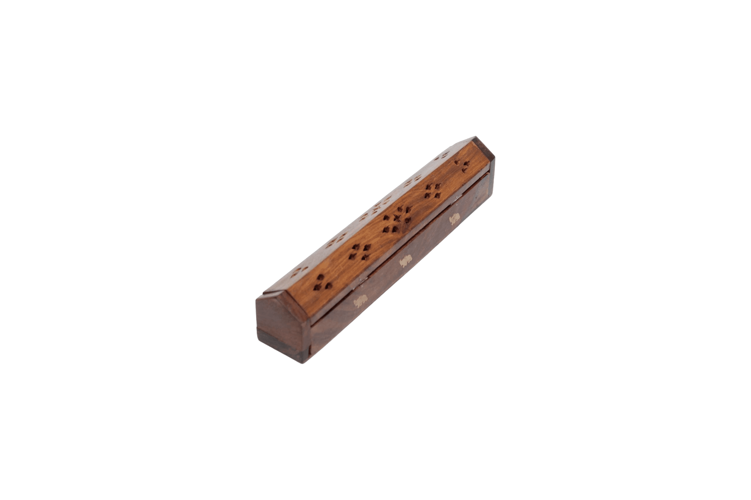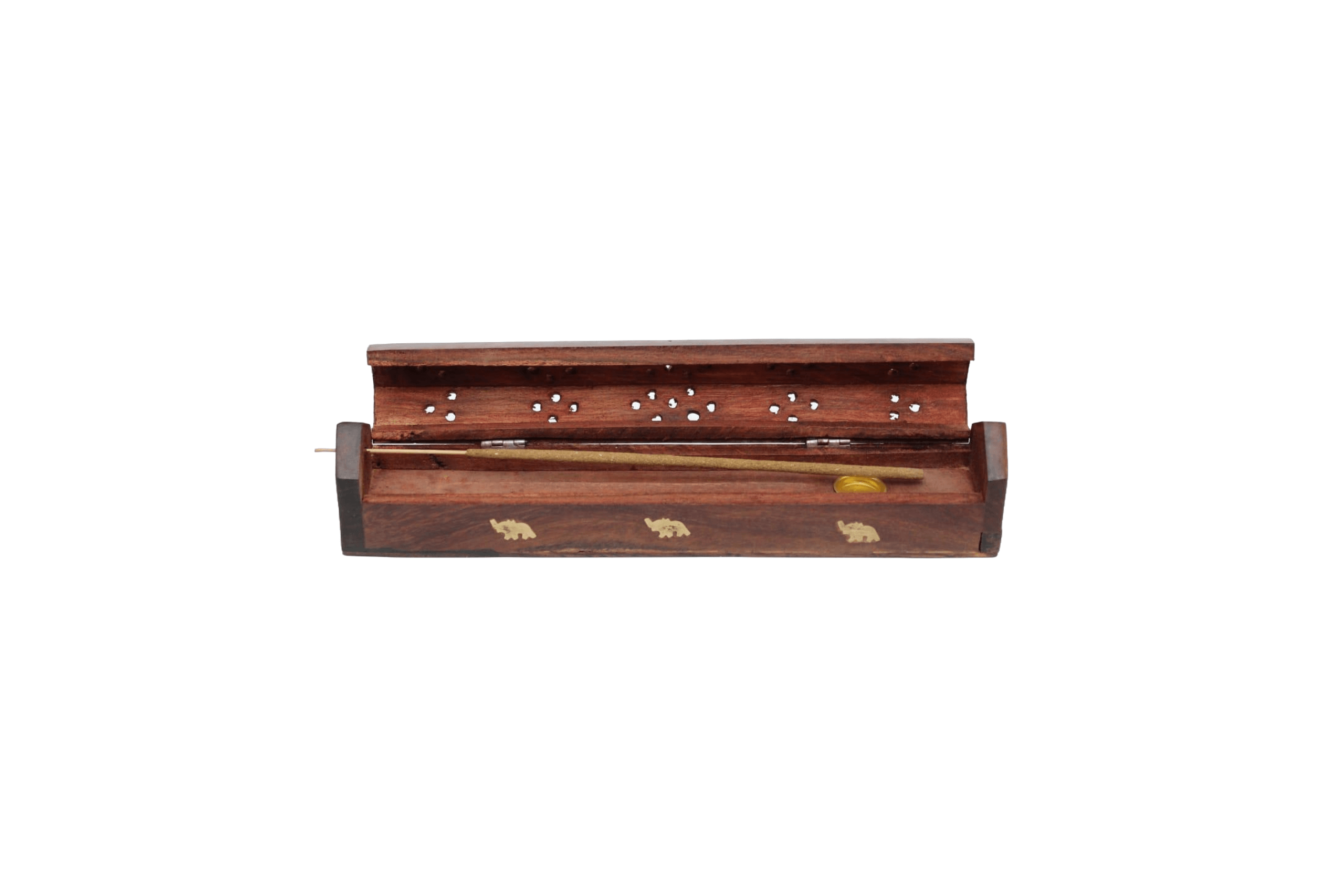 This Wooden Incense Burner Box is both functional and decorative. Crafted from rich wood with intricate brass inlays of elephants, it serves as a beautiful and practical accessory for your home.